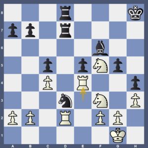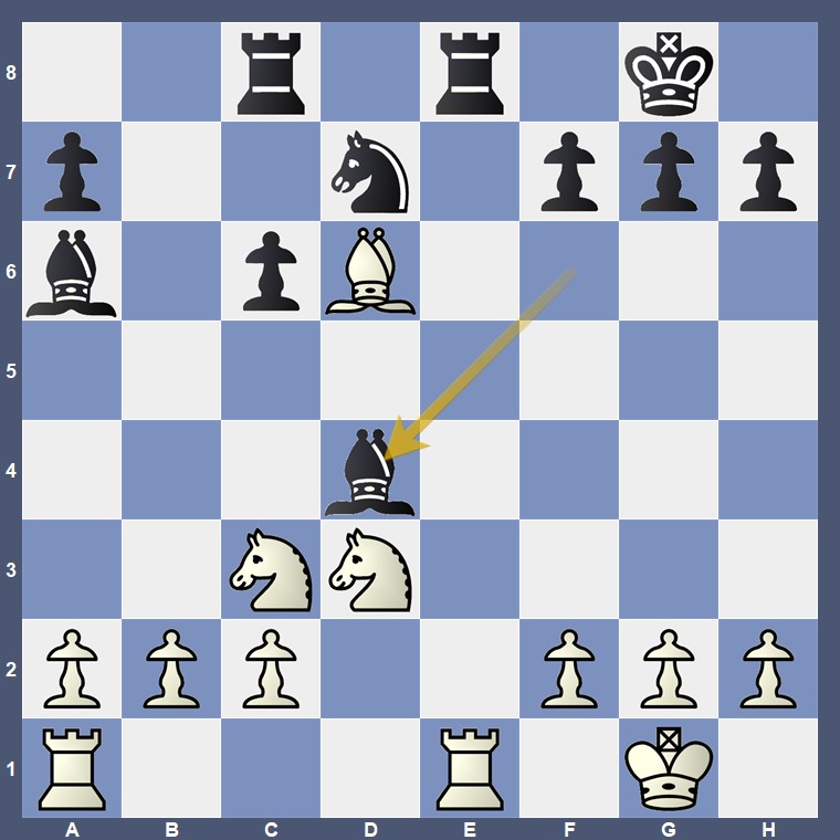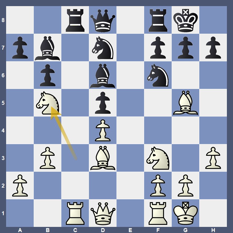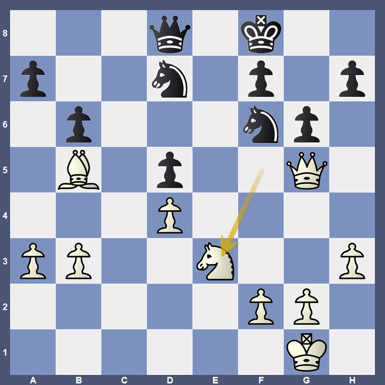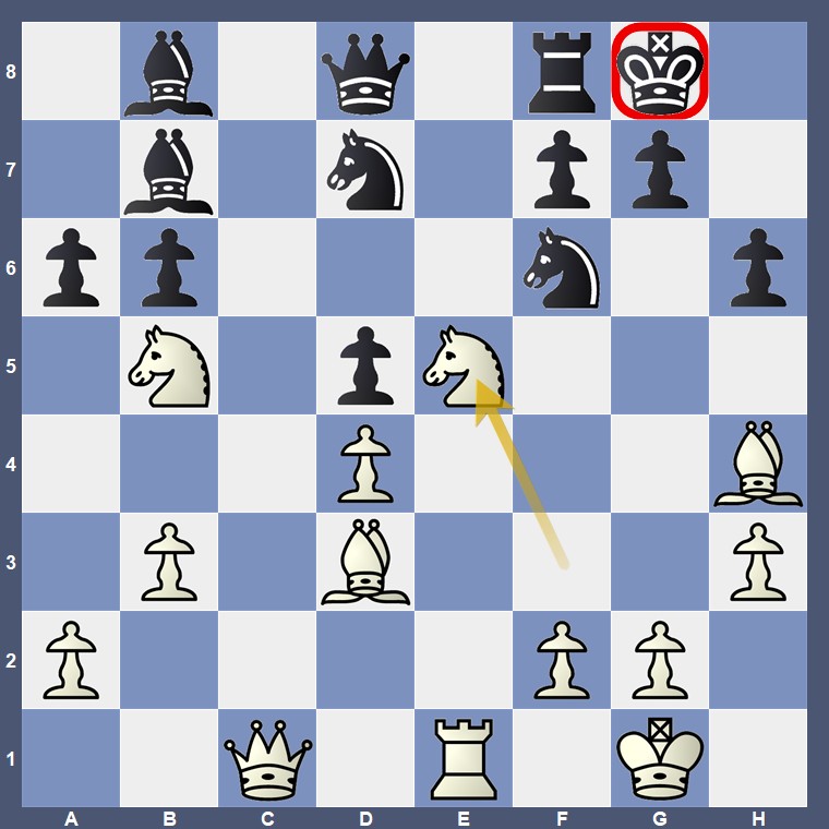 13. … е:д5? План црног скроз је погрешан. Овде је било изнуђено 13. … Л:д5 14. С:д5 е:д5 15. Дд2 Т:ц1 16. Т:ц1 Дб8 17. Сх4 г6 18. Лх6 Тц8 19. Сф5!! Т:ц1+ 20. Д:ц1 Лб4 21. Лб5! Дд8 22. а3 Лф8 23. Дг5 Л:х6 24. С:х6+ Кг7 25. Сф5+ Кф8 26. Се3 (дијаграм бр. 2) и црни д5 тешко се може одбранити.
