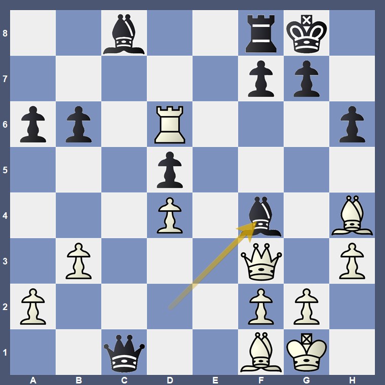 21. … Лф4! 22. Дф3 Лд2 23. Те7 Д:ц3! Изван сале за игру, у ходнику намењеном првенствено пушачима, неко је прокоментарисао да је боље било узети 23. … Л:ц3. Међутим такав потез био би груба грешка јер би бели најпре припретио мат изнудивши слабљење краљевог крила црног, након чега би измењао даме и појео централног д5-пешака: 24. Дф7 г6 25. Д:д7 Д:д7 26. Т:д7 Лц8 (још горе је 26. … Ла8 27. Лф6! и пада неки од пешака на дамином крилу) 27. Т:д5 и бели би вероватно добио партију.
