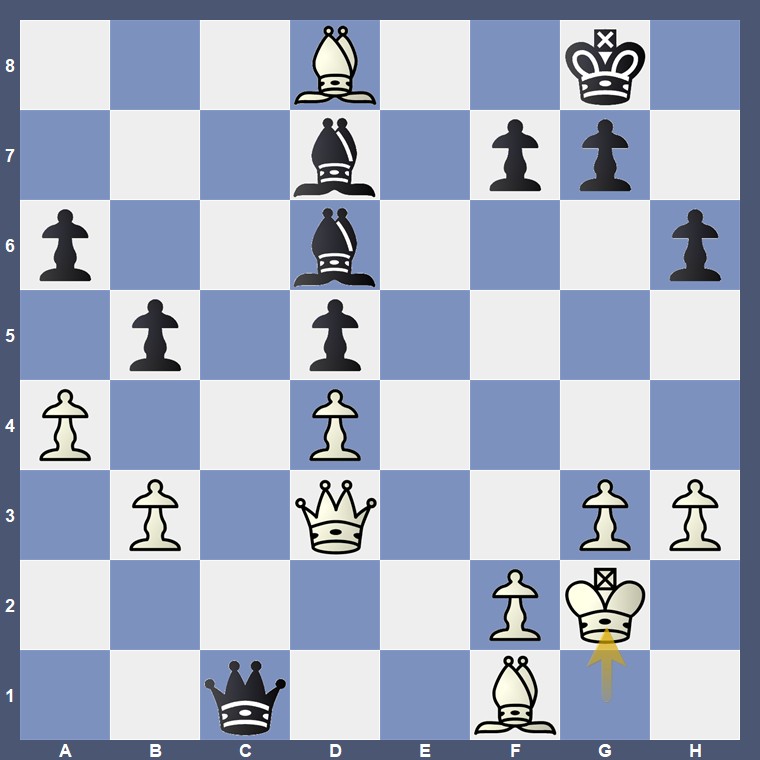 30. а4 Лд7 31. г3? Непотребно слабљење. Није јасно како је бели желео да распореди фигуре на краљевом крилу. Да ли да стави краља на х2, па ловца на г2, претећи узимањем централног пешака?