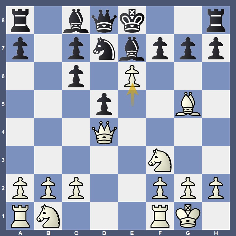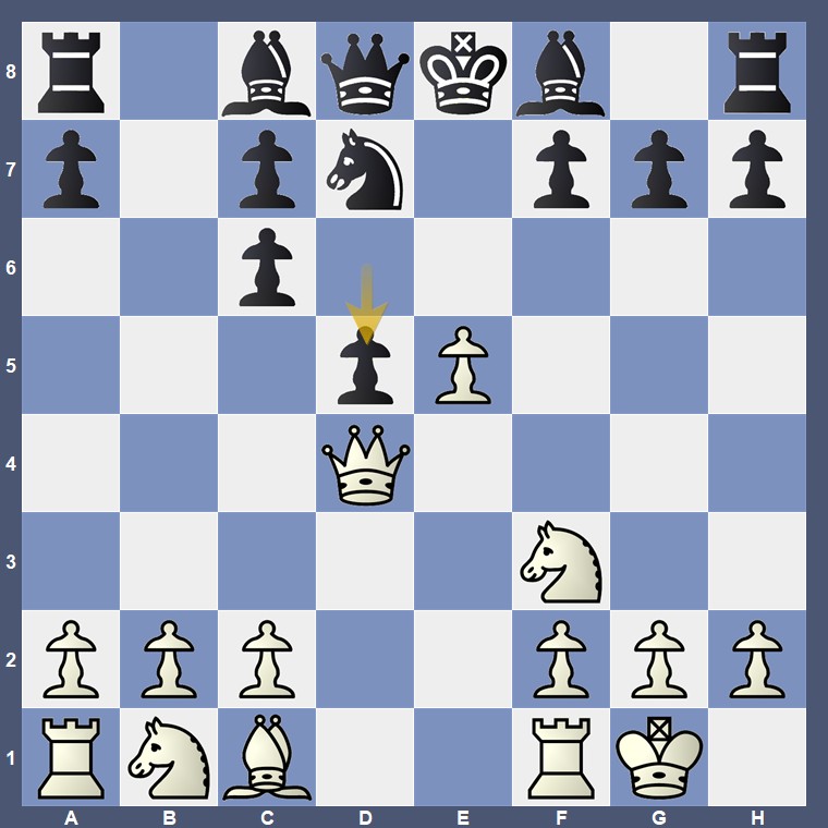 5. е5!? Сц6 6. Лб5 Сд7 7. Л:ц6 б:ц6 8. 0-0 д5?? (види дијаграм бр. 1)