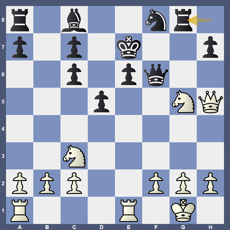 У овој позицији, бели би могао да настави са нападом на угроженог краља, нпр. 17. … Таф8 18. ф4 х6 19. Сгф3 Д:ф4 20. С:е5 Дд4+ 21. Кх1 С:е5 22. Сф3 Т:ф3 23. Т:ф3 Кд6 24. Тф6+ Кц5 25. Д:е5 Д:е5 26. Т:е5 Л:ц4 27. Тее6! Лб5 28. Т:х6 Бели је добијен у овој завршници. Два везана слободна пешака обезбеђују му јасан добитак.